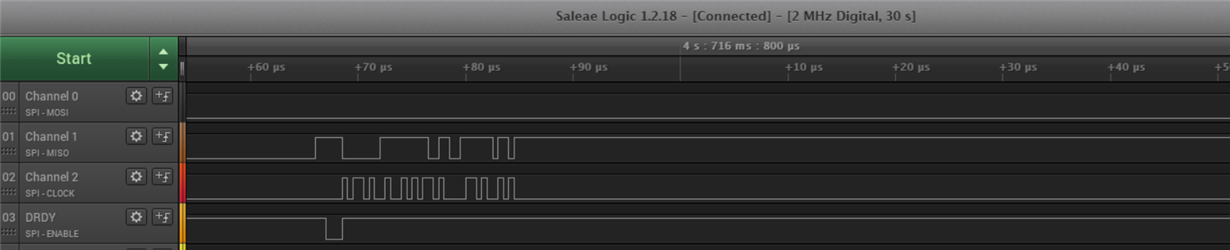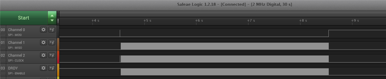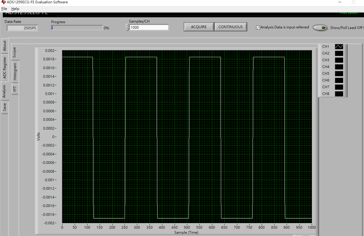 I used the EVM to test the internally generated square wave of the ADS1299. At the same time, I connected the logic analyzer to the ADS1299. However, the data obtained from the logic analyzer is different from the data obtained by the EVM. What is wrong? To get the correct output on the instrument?