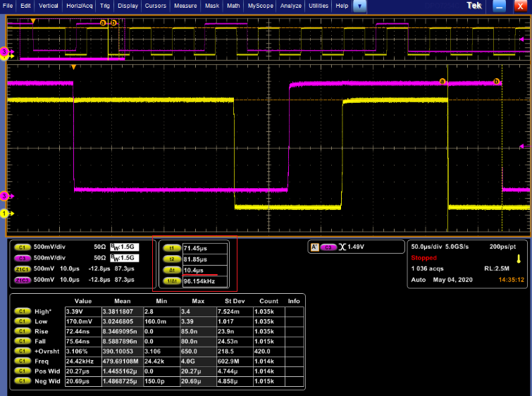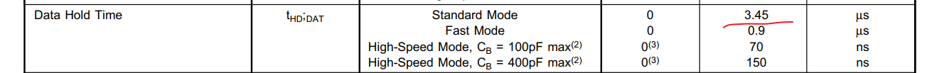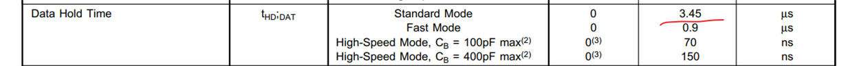 We want to check the hold time requirement below for the ADS7828 SDA. Currently the datasheet gives the standard mode value is 0-3.45us. What does it means about the 3.45us? We need to keep the hold time larger than 3.45us, correct? Currently my customer use 25khz, the test hold time is 10us(>3.45us), whether it has risks? Thanks.