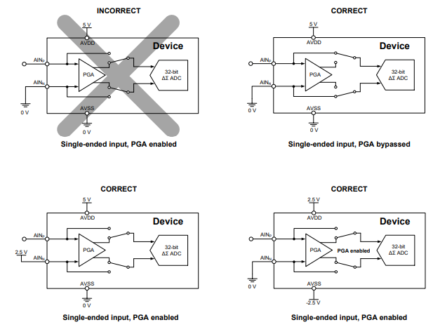 You can use either first configuration or second configuration with a 2.5V DC bias voltage. The ADC is measuring the voltage difference between the channels including AINx and AINCOM. The AINp is the signal you are going to measure and the AINn is reference input, for example, you can use AIN0 as input channel for your signal and the AINCOM as the reference to the ground.
