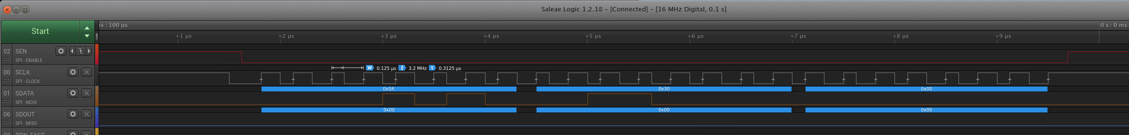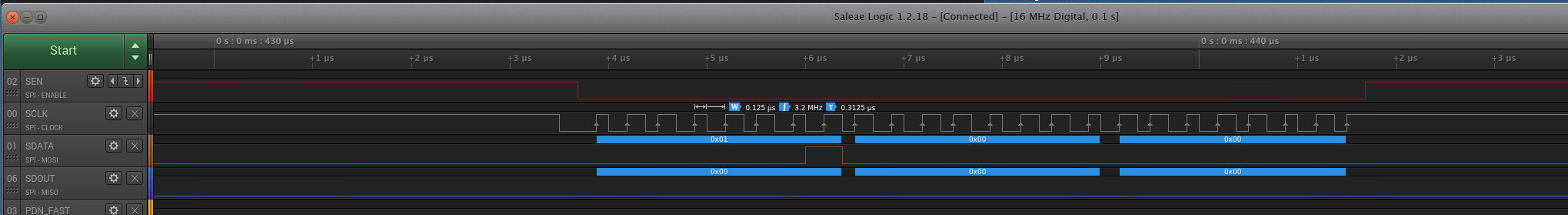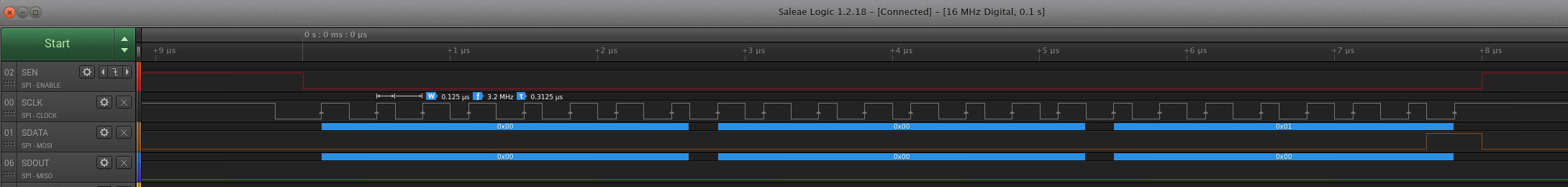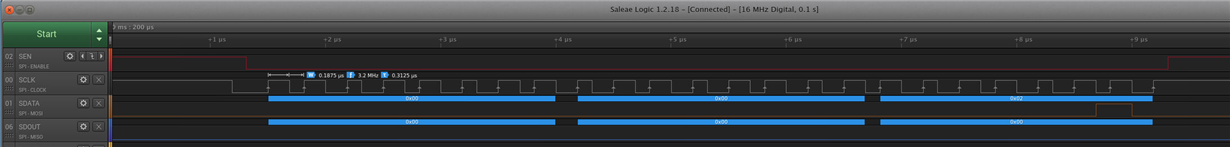 The problem is that every read that I perform, I only see SDOUT (SPI-MISO) as 0. I have the SPI bus pins probed with a logic analyzer to confirm the transaction is according to the datasheet. I have even double checked that the logic analyzer is reading the SDOUT test point correctly by probing with an oscilloscope.