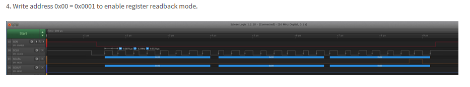 4. Write address 0x00 = 0x0001 to enable register readback mode.