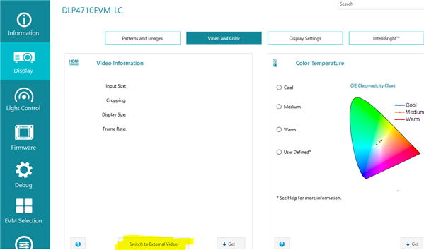 I am trying to insert an image into the DLP4710-LC via the HDMI cable and was wondering how I might do this. I have tried to control the DMD via the GUI, but it does not respond when entering different patterns. Any advice/help you could give on how to achieve this via the HDMI cable would be greatly appreciated.