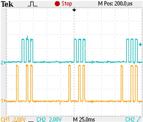 Immediately, I Measured the signals Trig_in and Trig2_out with oscilloscope and the screenshot as below.