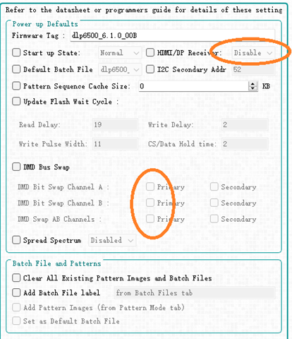 uncheck DMD bit swap channel A, uncheck DMD bit swap channel B, uncheck DMD swap AB channels and Disable HDMI/DP receiver