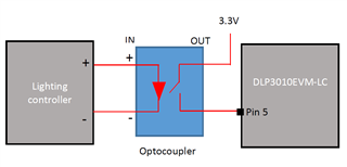 Lighting controller that I use are supply voltage 12V-24V. We are add optocoupler between lighting controller and projector DLP3010EVM-LC to prevent projector are broken when there are high voltage supply. So I have question, where I can get 3.3V to connect with my optocoupler to make a complete circuit?.