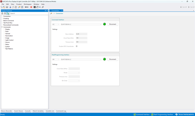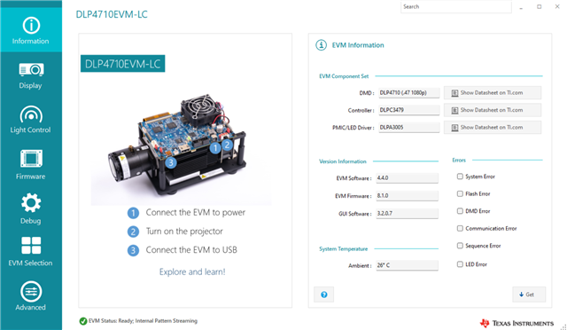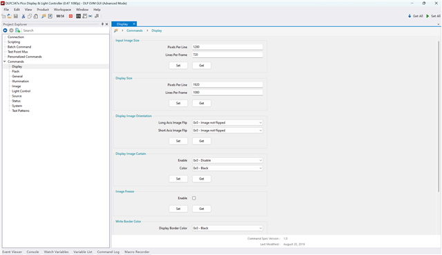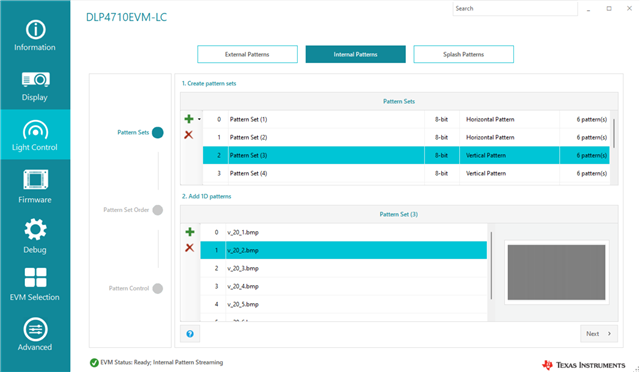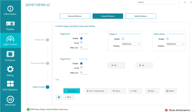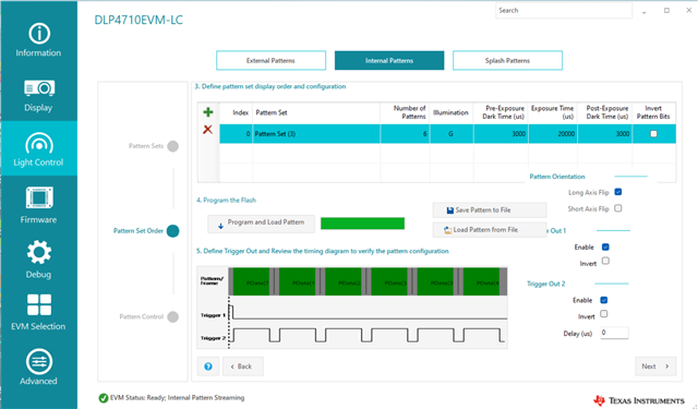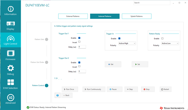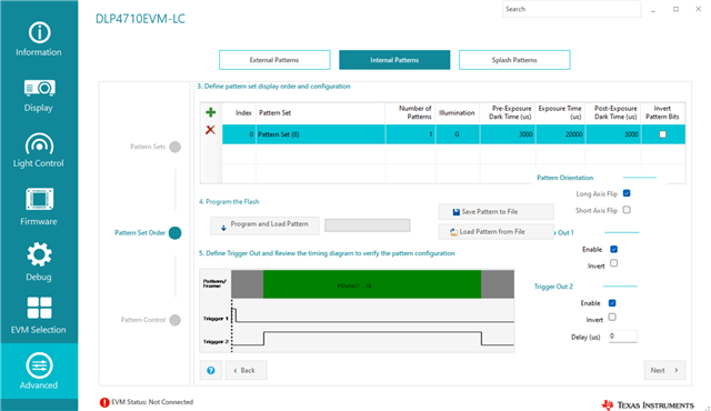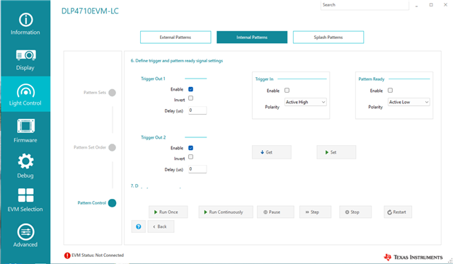 At first , the EVM can normally display patterns , but it cannot output "triiger2" signal in light control mode and it can output "trigger1" signal (I have connected pin2 and pin3 of J7 , pin2 and pin3 of J9). So ,I update the firmware and the EVM cannot display pattern normally. I have updated firmware in version "v8.1.0","v8.3.0" and "v8.4.0" , but the issue still occurs and the EVM also cannot output trigger signal.