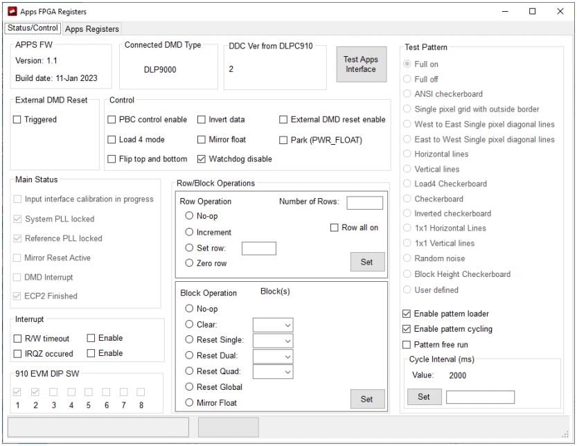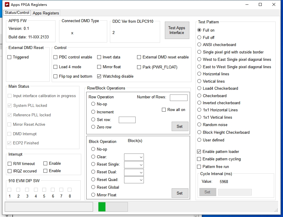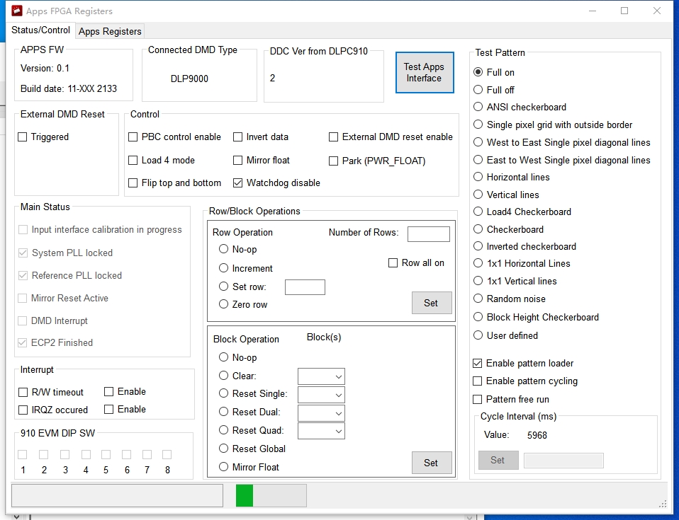 上图为实际测试时出现的现象,Apps FW的Version:0.1;Build Date:11-xxx-2133;Connected DMD Type:x与DLP9000之间变化。