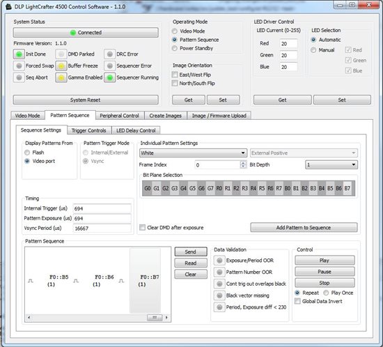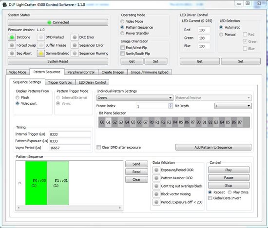 On the previous LightCrafter, it was trivial to display at 1440 fps by setting Video Mode Setting to "Bit Depth = 1, Frame Rate = 60"; you could then send a 60Hz video signal over HDMI with one frame encoded in each bitplane. However, with the 4500, I don't see how to do this - It looks like it might be possible using the steps outlined in "3.3.1.1 Pattern Sequence Example" in the Lightcrafter 4500 Users Guide, but it's both laborious and hasn't worked so far.