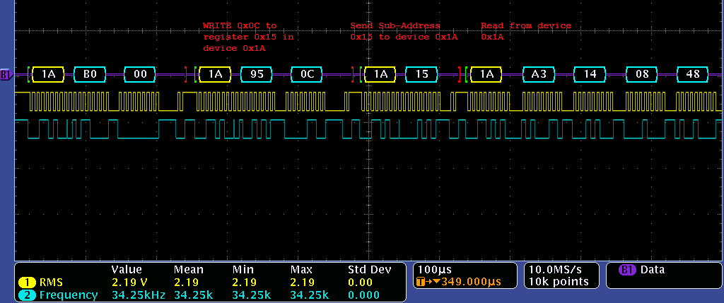 Example, My I2C data for a Read Manufacturer ID "S 0x1A(W) 0x95 0x0C P S 0x1A(W) 0x15 P S 0x1A(R)" After this I read and I get "0xA3 0x14 0x08 0x48". I always get that same pattern, no matter which register I try to read. Based on the Programmer's Guide I expect to see a 0x01 or 0x00 as the first byte from the DLPC350.