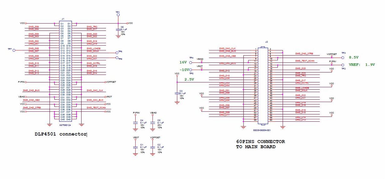 Please refer to the DLPDLCR4710EVM, http://www.ti.com/lit/pdf/tidrew6 , schematics and the pix below from that schematic.