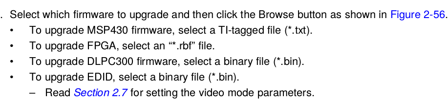 Hi. According to user guide (http://www.ti.com/lit/ug/dlpu006e/dlpu006e.pdf) while upgrading firmware of DLP3000, above *.txt, *.rbf and *.bin files must selected. But where can I download these files. I can not found them in your official website.