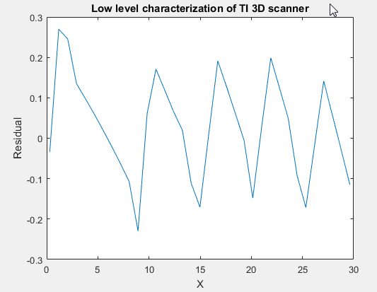 To show this, after taking point cloud of flat background with the system, I fit the points with a plane by regression of z with x and y, and compute its residuals. Then displayed residuals in a small region ( 30mm x 1 mm in X x Y) by X. as following.