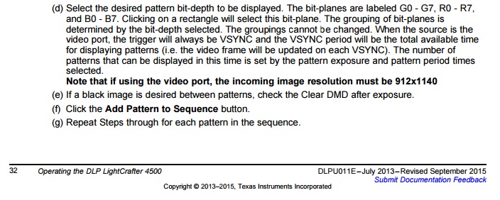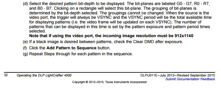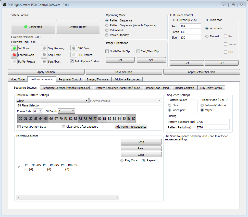 We're driving the LCR 4500 at 120 hz sending 24-bit RGB data. I'd like to display the first 6-bits of each plane, in order to get 360 hz. To that end I set up my pattern sequence as in the image below, and it validates and plays without throwing any errors. However, when I read back the pattern sequence, it shows as in the second image. This is causing the colors to not display as expected since we aren't displaying the expected bits.