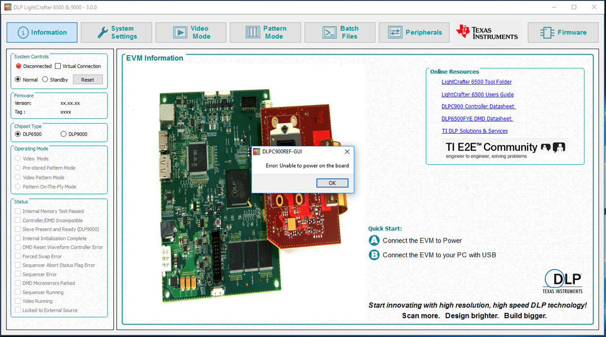 I am attempting to run the DLP Lightcrafter 6500 EVM. I have plugged it in to the correct +12 V DC power supply. I have also verified that power is reaching the device by using a multimeter; the soldered pins for the power input also show +12 V DC.