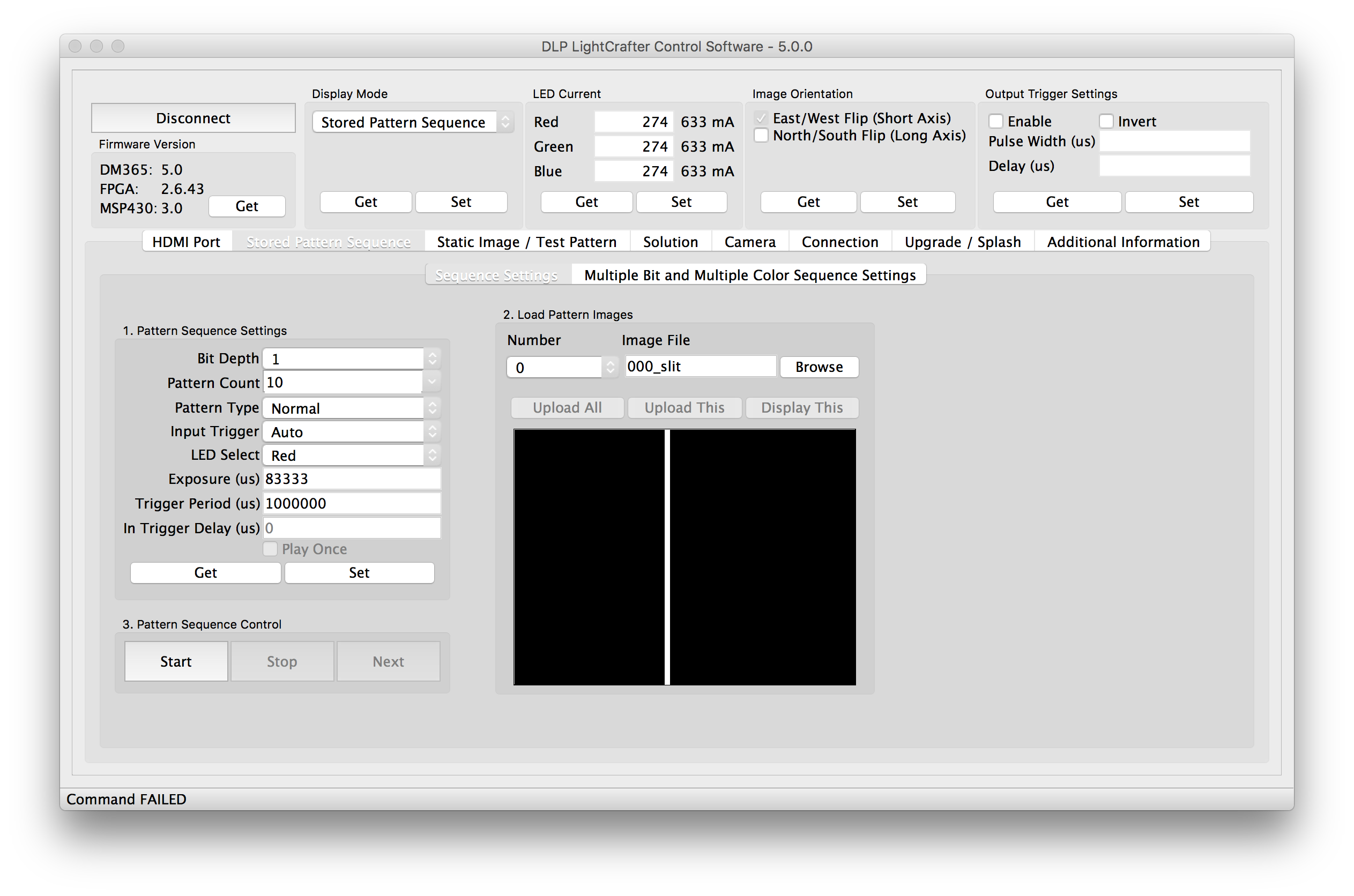 I am currently trying to upload created images as a Stored Pattern Sequence. The images are BMP, 608x684 and are 1-bit length. The file names are ###_name. The images upload individually in the Static Image/test Pattern window, but when attempting to upload a series of them in the Stored Pattern Window, the upload command fails.