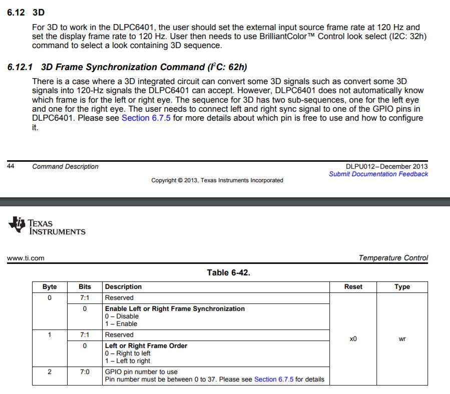 I understand now. I will look into some of our design partners to see if any have a solution for your situation. I did find in the dlpc6401 programmer's guide a section pertaining to 3D. It looks like you design will require a special IC that will convert 3D video to something usable by the DLPC6401. It will also require some configuring some setting of the DLPC6401. See below.