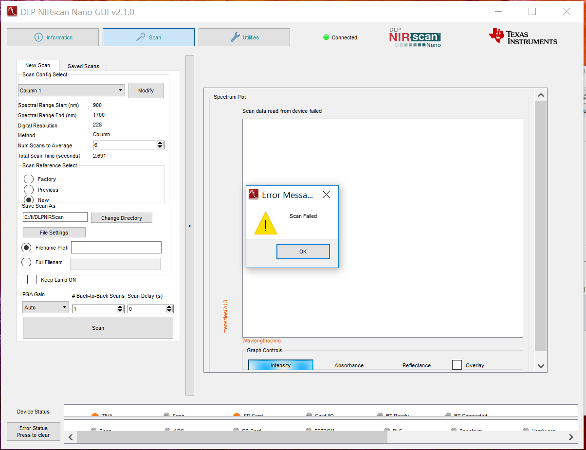 When we connect the device via USB and try to scan thru the DLP NIRScan Nano GUI, it always encounter an error.