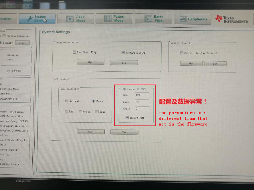 And then the second problem, sometimes we found the DLP didn’t execute the I2C command (except restart command) after power-up or restart. From the GUI(DLP LightCrafter 6500&9000 - 3.0.0), we found the DLP entered Standby mode, and the parameters got from DLP were different from that we set in the firmware. If we use GUI to control the DLP, it would report an error. This problem can only be solved by restart(by I2C command or power-down and then power-up).