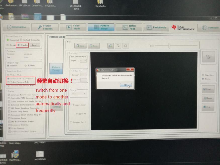 These two problems could appear on each one of our projectors, and they have some common points. For example, they appeared occasionally and we can't find any regularity, and they always appeared after power-up or restart and can only solved by restart. It looks like the DLPC900 or DLP9000 might get some mistakes in the startup process. Have you ever found these kinds of problems before? Do you have any idea to solve these problems?