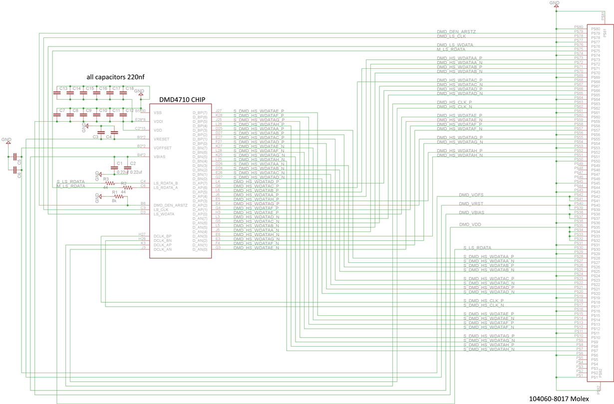 Because I am using a type A ribbon cable (just like young optics does) the pin 1 (on the molex connector) on the control board goes to pin 80 of the dmd pcb.