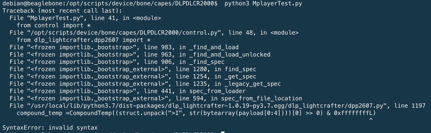 My issue is very similar to what another user experienced, but the suggested action doesn't seem to be resolving the problem. I'm trying to run the video test file, MplayerTest.py using Python3. I've encountered this syntax error in dpp2607.py. Note that I've already changed this line of code (1197) several times and re-run the setup.py to install the changes, otherwise none of the changes, including blocking out the whole code bock, appear to compile. If I block out this whole compoundTemp code block in dpp2607 then I get the import i2c error that the previous question described. The original line of code that threw the error was lacking the outer parenthesis and 'CompoundTemp,' but as all the other code blocks have that structure, I tried adding it to no avail. I'm wondering if someone who has been able to clear this error could advise?
