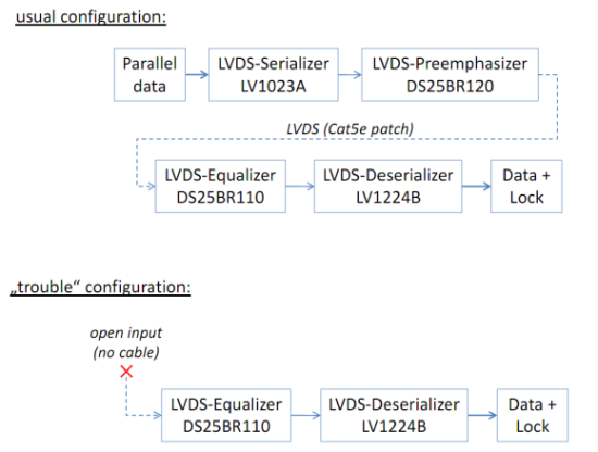 In an usual configuration, the data is received correctly, but if no cable is attached to the receiving unit, a "false-lock" occurs and fades spontaneously on the output of the de-serializer, resulting in random false-data on the output of the de-serializer. In this state, it seems that the rate of "lock"- and "non-lock"-time varies depending on the frequency of the reference-clock of the de-serializer (tested 10MHz up to 40MHz) AND the level of equalization of the (National Semiconductor's) DS25BR110. Any way, this is not the behavior we expected. We thought that an open input (no cable) results in a constant inactive "lock" signal and tristate-data.