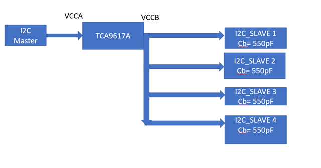 Pull ups are provided at each slave. Little bit afraid of loading caused by 4 slaves on one output of TCA9617A.