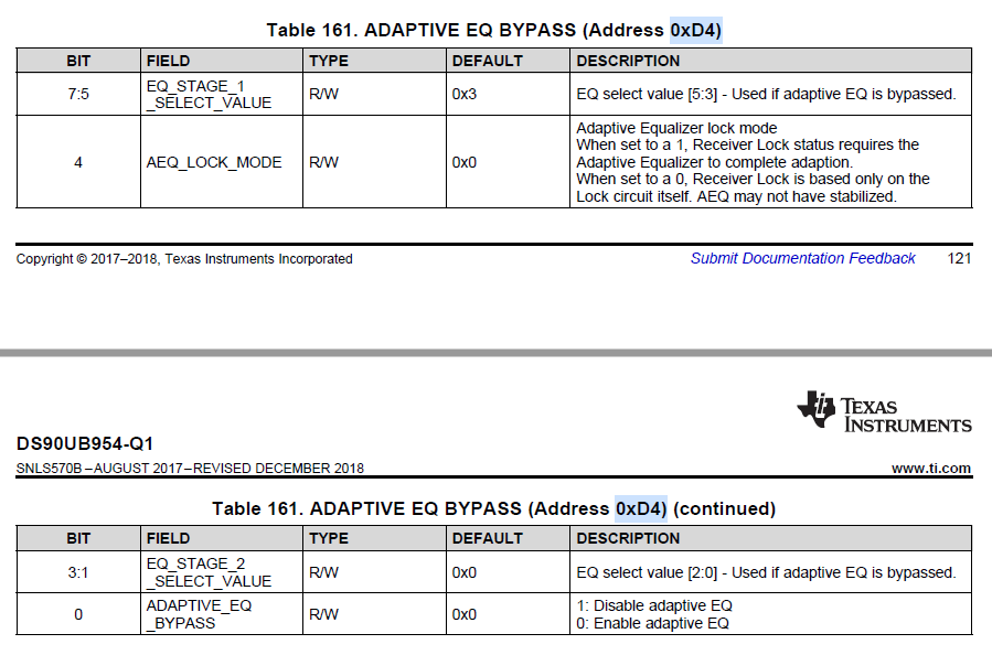 2. Change the deserliazer's AEQ setting. We try to disable adaptive EQ, and increase EQ value. But I don't know how to change the EQ value? Why do we have two settings, bit 7:5 and bit 2:0? What is the relationship between bit 7:5 and bit 2:0?