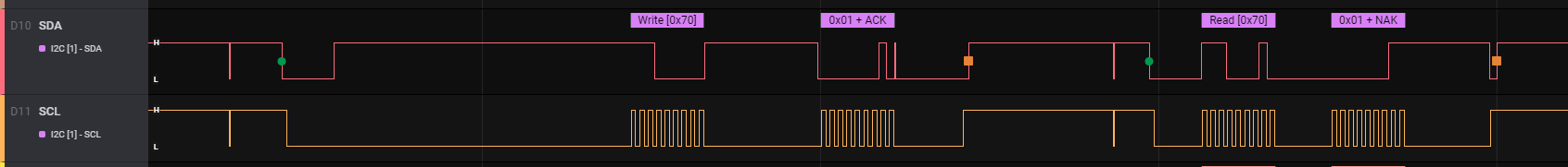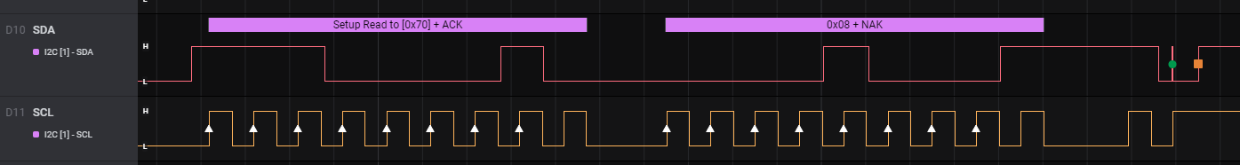 As you can see in the capture, the buses become active once the command is received. But Even sending 0x09 gives back 0x08 when reading the register.