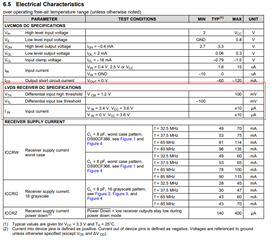 Electrical characteristics can be found in the datasheet. The below image shows the LVDS receiver DC specifications, including Vcm: