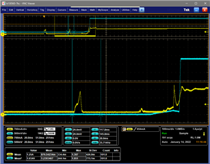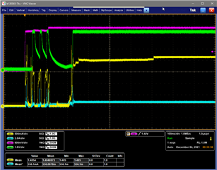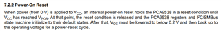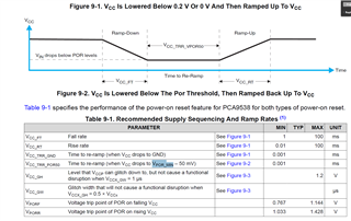 We are seeing a relatively small temperature around 50C where the PCA9538 device does not initialize to the proper reset default register values. In this design, the RESET is tied high to 3.3V VCC through a 10k pullup. We do see the 3.3V cycle on and off several times prior to the final power on resulting in the bad register defaults. I'll attach a scope shot of this, but the during the last power-off cycle before the final power-on, the voltage does look to go comfortably below the 0.767 Vporf threshold, so I believe is meeting all the specs for a good POR. (green trace in scope plot)