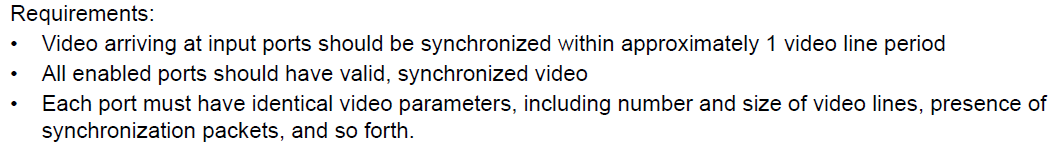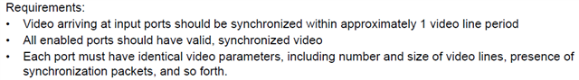 The video arriving at input ports should be synchronized within approx. 1 video line period.