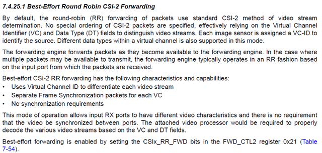What is the customer trying to do? Does their system handle multiple VCIDs (virtual IDs)? If it does, then you can just use the Best-Effort Round Robin CSI-2 Forwarding. Are they considering synchronized CSI-2 forwarding?