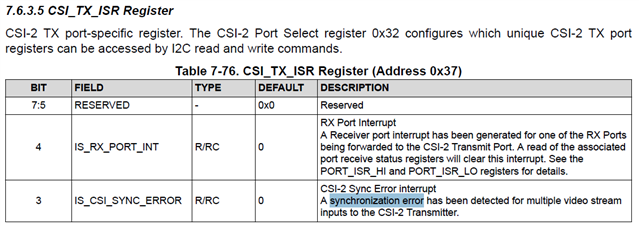 My suggestion would be to check if all the devices are synced. In your reply you said that reg 0x37 = 0x07, but in the register dump you shared, it shows 0x37 = 0x1. Can you please check if you are getting any IS_CSI_PASS_ERROR?