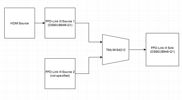 We are using the DS90UB949A-Q1 to convert HDMI to FPD-Link III which is then sent to a remote Deserializer connected to a Display. In order to be able to switch between multiple video sources we are using the TMUXHS4212 as shown in the picture below: