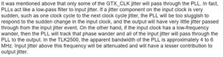 I’ve got a question on the TLK2711-SP that I was hoping you could help me out with. I would like to get some more information on the device’s GTX_CLK input, specifically around jitter. I am pairing this device with the Vectron 1419R103M6800BS which has a quoted period jitter pk-pk of 40ps. Per the datasheet for the TLK, I see that there is a maximum allowable of 40ps on the Peak to Peak jitter. I was curious about the rationale for this specification. Additionally, I noted in a TI app note (here) the below
