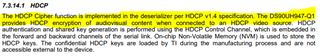 HDCP is a type of encryption that protects digital intellectual property. An example of the necessity of HDCP in a system would be if a display were used to show copyrighted content that had been transmitted through an FPD link device. I have included a screenshot from the DS90UH947 datasheet that also provides information regarding HDCP. Please let me know if you have any further questions.
