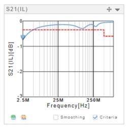 The below picture is their POC design insertion loss simulation and they found the IL value drops below -0.35dB when frequency <5MHz. This doesn't meet suggested characteristics in datasheet. Is there any risk and is it acceptable?