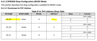 However, when I look at table 7-1 of the data sheet, the table indicates RX_D3 is assigned a pull-down on power up. This indicates to me that the 'default' value of that pin would be 0, not 1 as indicated in table 9-14.