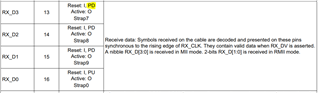 I want to make sure I understand the relationship between the default values and the specified PU/PD assignments per pin. In the example above, in basic mode, the table indicates the DEFAULT value of RX_D3/PHY_ADD0 is 1. To me, this would indicate an internal pull up is present on that pin.