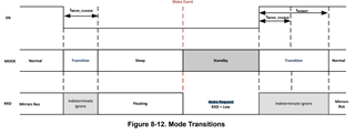 We are sending an 11-bit low wake up request on start up, but the TLIN1021 does not come out of this indeterminate mode. I have measured the behaviour and Tx is being pulled HIGH, Rx is sitting LOW. We are currently experimenting with toggling our dominant LIN bus, to see if we can initiate a wake-up request, which by all other means seems to be ignored.