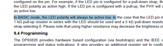 I developed a test board using DP83826E in basic mode. It should be strapped to proper operating mode. This brings up the strap up/down issue at the LED pins again.