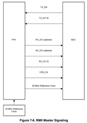 In RMII master mode, the 50-MHz clock is output on RX_CLK pin for use as the reference clock for an attached MAC.