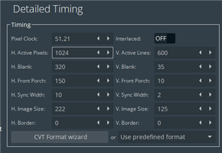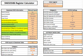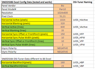 The settings of the excel sheet that i used to get the testpattern to work with the SN65DSI86 are the following: