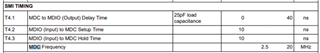 In the electrical characteristics section of the datasheet, it says that the maximum frequency of MDC is 20MHz: