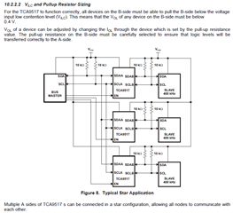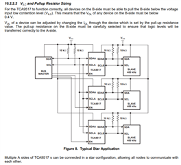 ・Is it use TCA9517 (TCA9517DGKR) in star configuration for B port? ・In the following excerpt from the datasheet, Although the A port side is star-connected. Is it possible to make a star connection on the B port side? Please let me know if there are any points to note in that case.