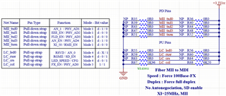 Our strapping for both PHY is as follows, and as said previously, this works fine, we have a consistent link-up and disconnect through signal detect, and the network adapter in windows follows the state of SD.