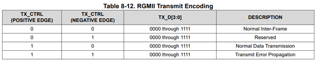 Could you explain more details about the below table 8-12 in DP83TC812S-Q1 datasheet under RGMII mode?