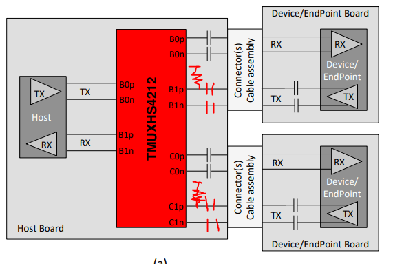 If the host bias voltage does not meet the MUX bias voltage requirement, then you will need to AC couple between the host and the TMUXHS4212. And the external bias network need to be added between the AC caps and TMUXHS4212 and can be done at either side of the MUX. This external bias network has to meet the MUX bias voltage requirement.