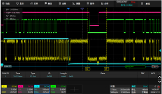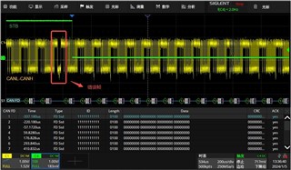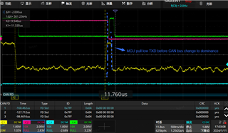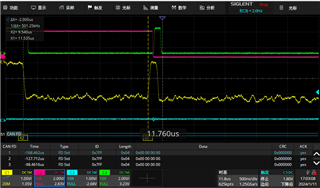 Error frame waveform(CH4 green one is standby pin, CH1 yellow one is CANL-CANH): use differential probe, so 0 stands for recessive, 1 stands for dominant state.